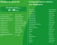 Carne de pollo separada mecánicamente, hígado de pollo, hígado de cerdo, piel de ave, aceite de linaza, aceite de pescado, harina de subproductos de aves de corral, manzana deshidratada, mango deshidratado, harina de trigo, fibra de caña de azúcar, agua, cloruro de sodio (sal común), carbonato de calcio, cloruro de potasio, goma xantana, colorante natural (caramelo IV), aditivo prebiótico (pared celular de levadura, fuente de mananooligosacáridos), vitaminas (A, D3, E, K3, B1, B2, B6, B12, pantotenato de calcio, ácido fólico, ácido nicotínico, biotina, cloruro de colina), minerales (sulfato de zinc, sulfato de hierro, sulfato de manganeso, yodato de calcio, selenito (Sulfato de sodio, sulfato de cobre).