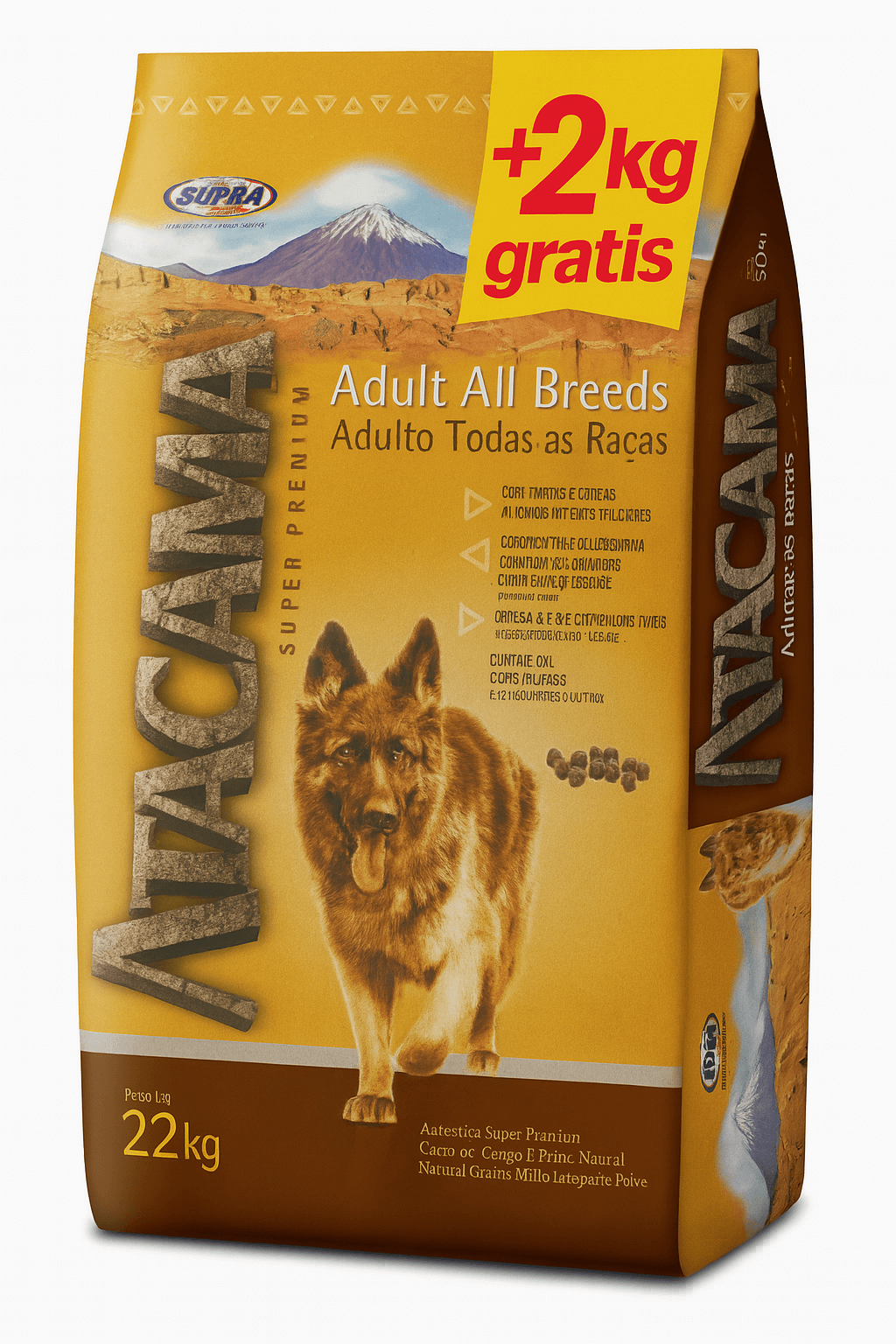 Atacama All Breeds 28% Proteínas Alimento para perros de todas las razas, libres de transgénicos y colorantes. Su formulación proporciona las necesidades nutricionales de los diferentes tamaños, etapas y estilos de vida. Diferenciales del producto Alimento ideal para perros de alto rendimiento y alta necesidad nutricional. Cinco fuentes de proteína animal de alto valor biológico: (carne, aves de corral, pescado, carne de cerdo y huevo, para dar mejor sabor a los alimentos) Adecuados para perros con exigente paladar. Condroitina y glucosamina ofrecen beneficios comunes. Omega 3 6 para la salud de la piel y y capa. COMPONENTES Harina de vísceras de aves de corral, harina de pescado de salmón, harina de carne y huesos, harina crujiente, huevo en polvo, hidrolizado de hígado de aves y cerdos, arroz partido, harina de trigo, semillas de linaza, pulpa de remolacha, levadura seca Cervecería, fibra de guisante, grasa de pollo, cloruro de sodio (sal común), sulfato de glucosamina, sulfato de condroitina, extracto de yuca (0,03%), bentonita, vitaminas (vitamina A, vitamina C, vitamina D3, vitamina E, Vitamina K3, Vitamina B1, Vitamina B2, Vitamina B6, Vitamina B12, Ácido Fólico, Pantotenato de Calcio, Biotina, Cloruro de Colina, Ácido Nicotínico), Minerales (Sulfato de Cobre, Sulfato de Hierro, Yodato de Calcio, Sulfato de Manganeso, Selenito de sodio, Óxido de zinc, Cloruro de potasio, Aminoácido quelato de cobre, Proteinato de selenio, Aminoácido quelato de zinc), BHA (Butil hidroxianisol), B.H.T. (Hidróxido de tolueno butilado), propionato de calcio, sorbato de potasio, aditivo prebiótico (pared celular de levadura (mananoligosacáridos)). - Este producto no tiene colorantes artificiales en su composición, estando sujeto a pequeñas variaciones en su color.